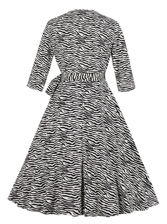 1950 Elegant V-Neck 3/4 Sleeve Striped Wear to Work Swing Dress