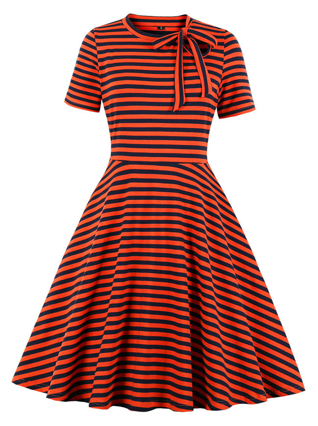 Elegant Retro Short Sleeve Striped Pattern Business Casual Dress