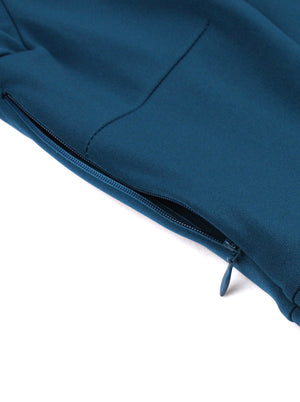 Women fashion elegant blue midi dress features: long sleeve, v neck with buttons attached and ruffled from left neckline to bust, zipper at side, high waist, knee length, a-line flared skirt style.