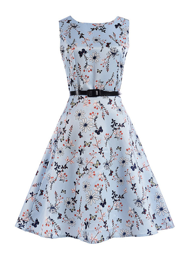 Killreal Girl's Sleeveless A-line Cocktail Dress Features Round Neck, High Waisted, Floral Patterns, Zip in Back, Matching with a Belt.