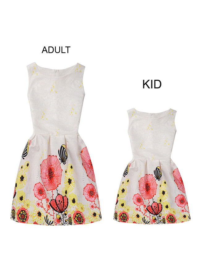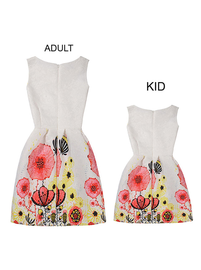 Jacquard Sleeveless A-Line Butterfly Floral Print Casual Dress with Zipper for Adult and Child