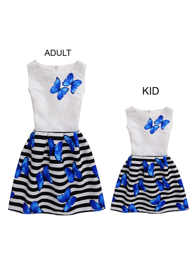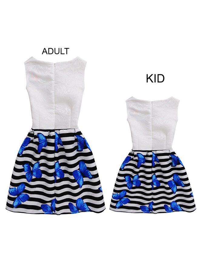 Jacquard Sleeveless A-Line Butterfly Striped Party Casual Dress with Zipper for Adult and Child