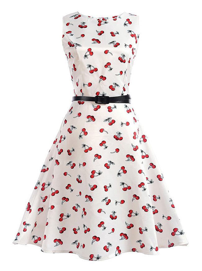 Girl's Round Neck Summer Party Sleeveless Dress with Cherry Print