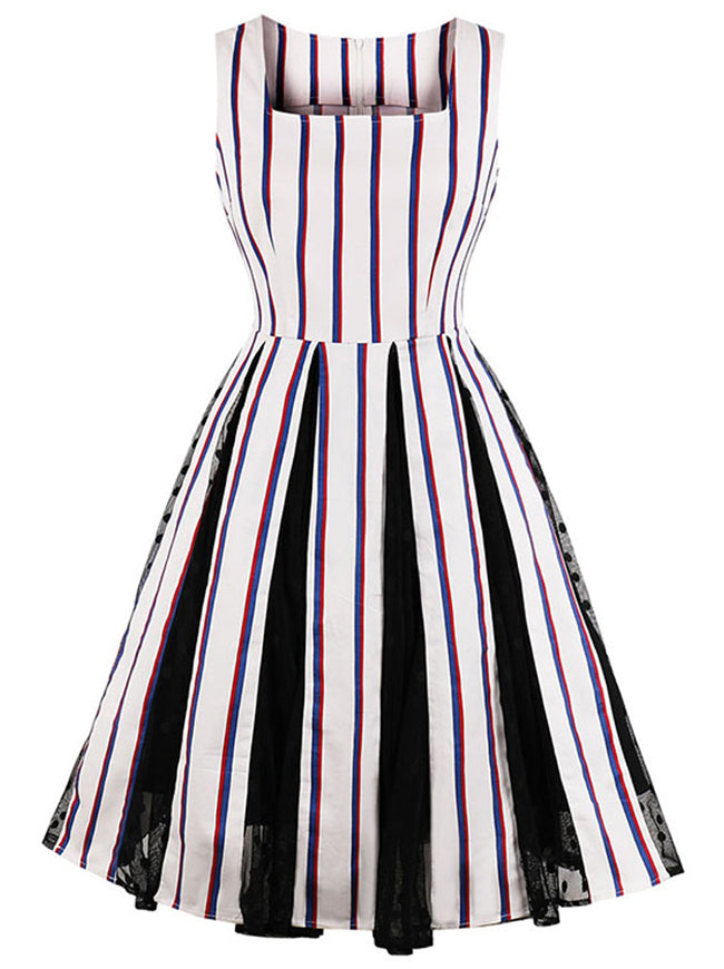 Women's vintage a-line midi dress featuring square neckline and sleeveless design, thin stripe print all over the dress, with black polka dot mesh splicing on the dress, concealed zipper at the back.