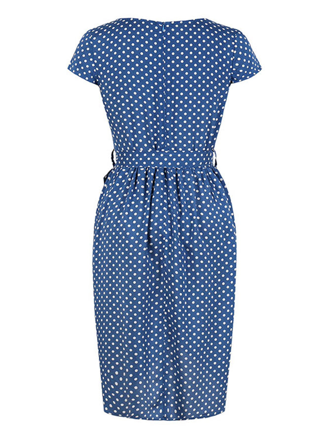 Women fashion elegant dress features: short cap sleeve, round neck, split at front, high waist design with belt, classic pattern print pattern cover the whole dress, hidden zipper at back.