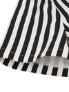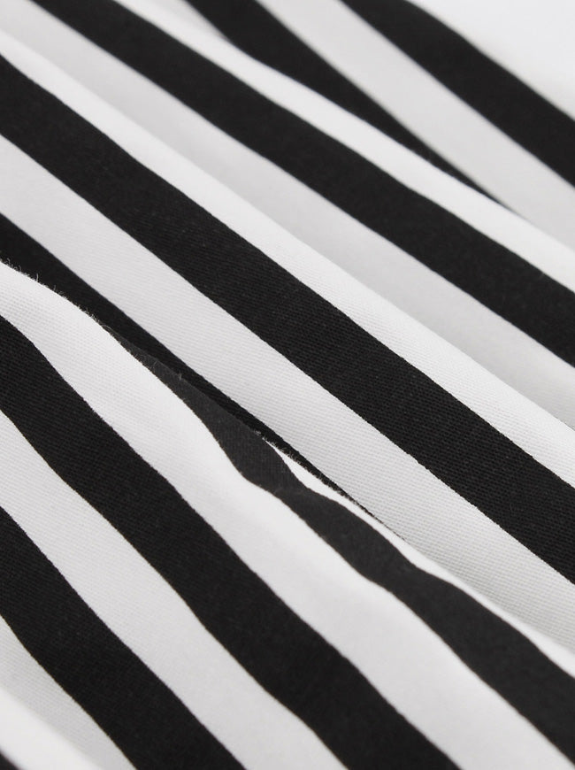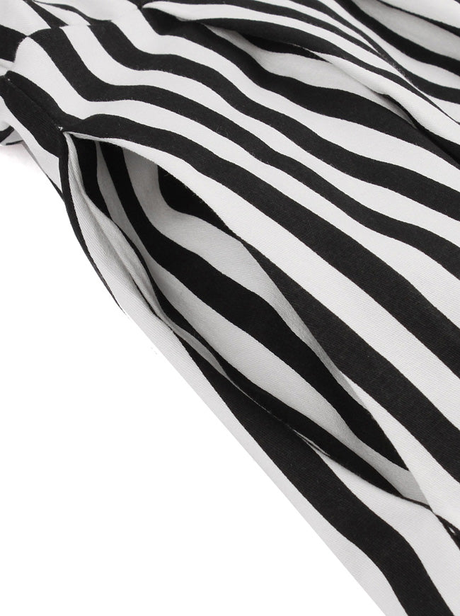 Women fashion elegant vintage style retro dress features: butterfly collar, short sleeve, knee length, button down at front, with pockets, a-line, fit and flare style, high waist design, classic white and black stripe print pattern cover the whole dress.