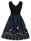 Women's elegant patchwork vintage style 1950s swing dress features: sleeveless, v-veck, zipper closured at back, high waist design, classic 3d print pattern cover the full cycle swing skirt.