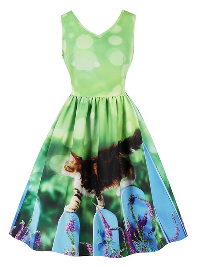 Cute A Line Party Dress Overlaid with Colorful Vivid Kitten Pattern, Sleeveless, V Neckline, Fit Flare Style, High Waist Design, Knee Length, Concealed Zipper in the Side.