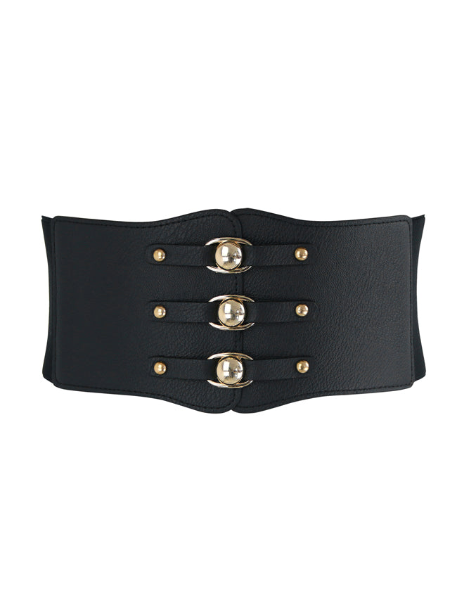 Decorative Metal Buckle at Front, Press Button Closure at Back, Splicing Joint with Stretchy Strap in the Back Half.