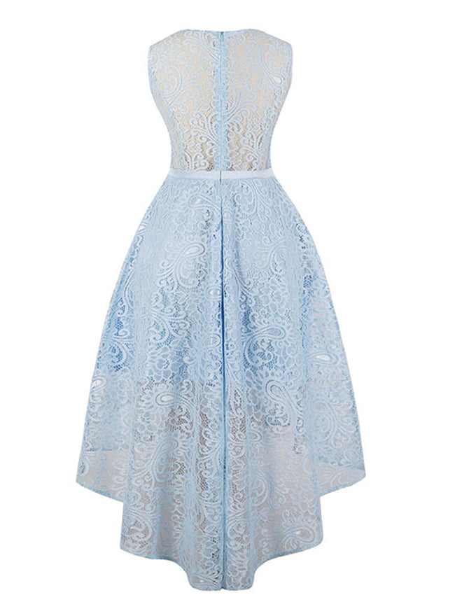 Women's elegant evening dress featuring round neck, sleeveless design, bowknot detail at the waist, concealed zipper at back. This asymmetrical lace dress suit for wedding party, evening formal dress, bridesmaid dresses.
