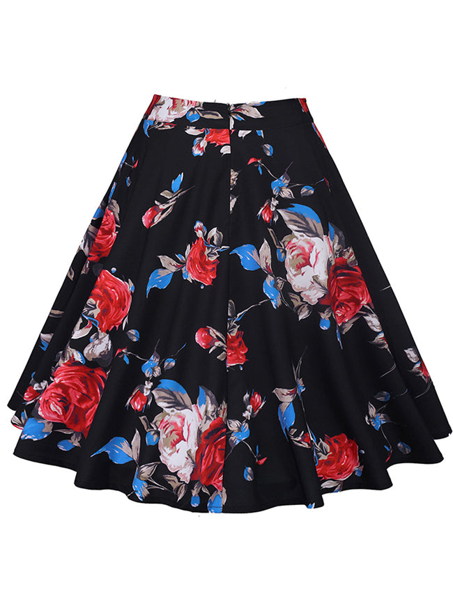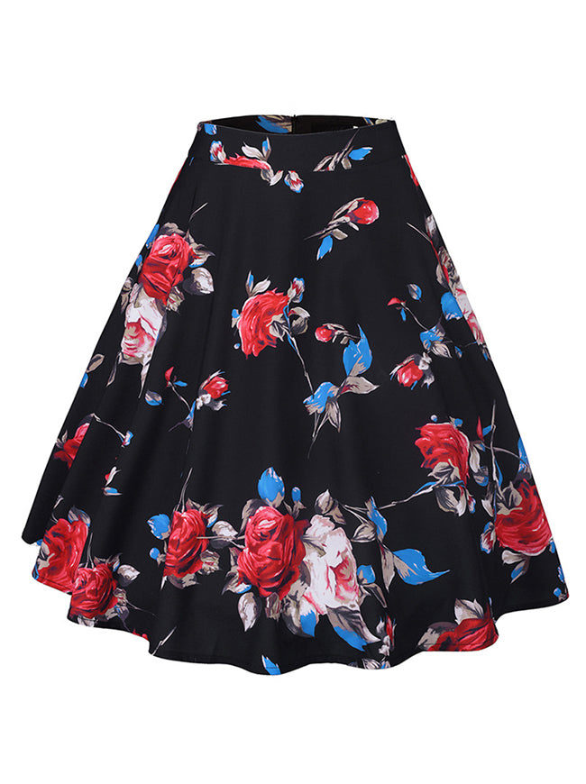 High Waist Vintage Rose Floral Print A Line Knee Length Skirt