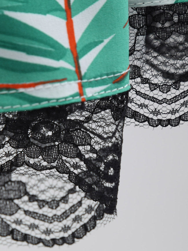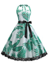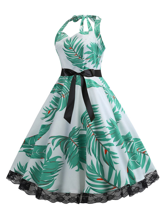 Retro Vintage Rockabilly Leaves Print Lace Swing Halter Dress