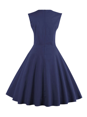 Sleeveless A Line Black Dress Featuring with Vintage Polka Dot Patchwork at Front, Criss Cross Design with Domed Buttons Accents at Waist, Zipper Back.