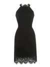 Sleeveless Full Lace Dress, Chocker Neckline with Buttons Closure, Cut Out Backless Design, Scalloped Hem, Zip in Back.