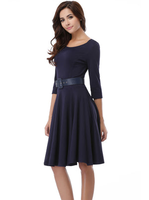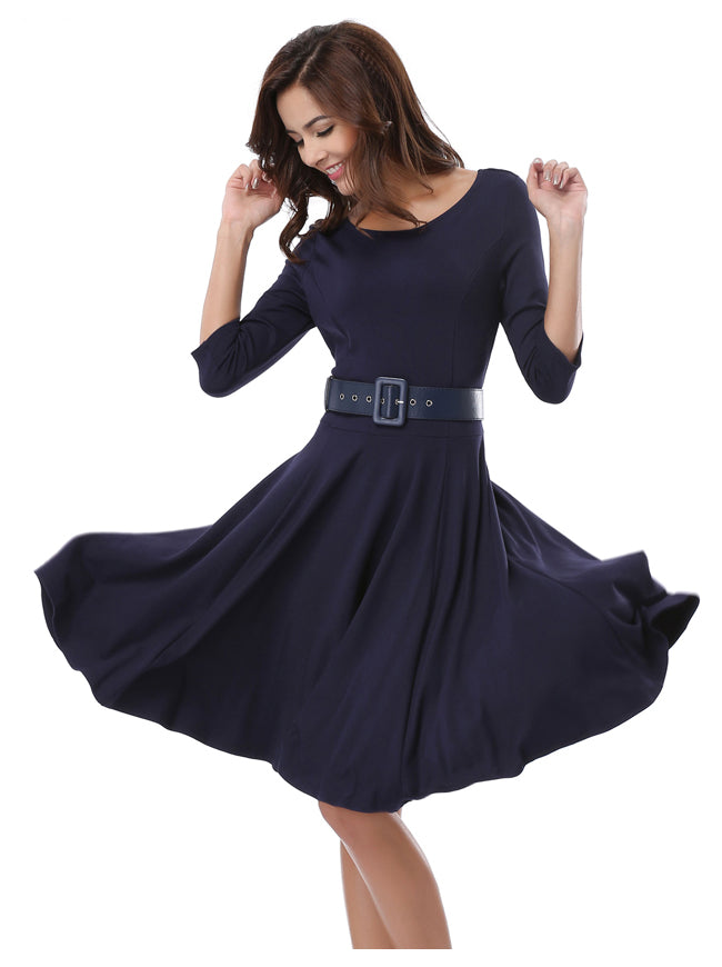 Simple and Elegant Plain Dress: Boat Neck, 3/4 Length Sleeve, Back Zipper, Matching with a Belt.