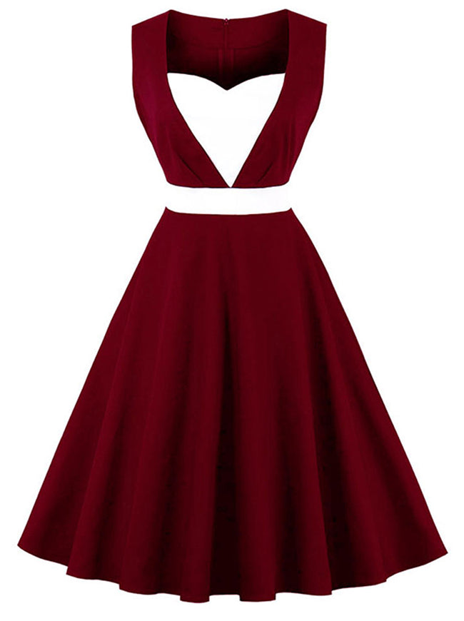 The A-line Vintage Cocktail Party Dress is Sleeveless, Low Cut and Zips in Back, Featuring with Colorblocking Patchwork at Front and Waist.