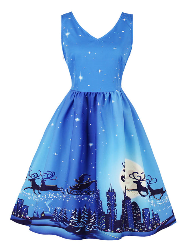 Sleeveless A-line Moon and Reindeer Pattern Christmas Holiday Dress