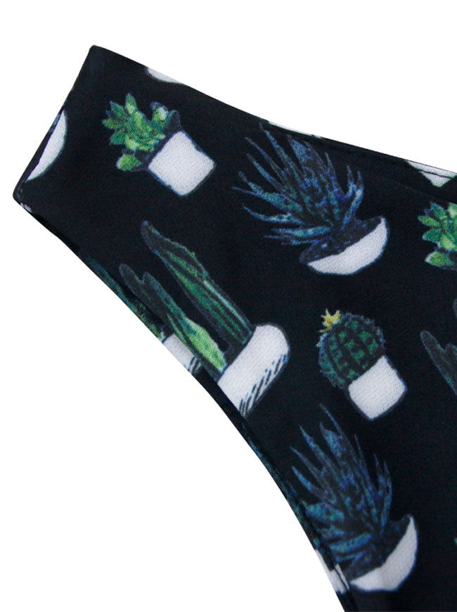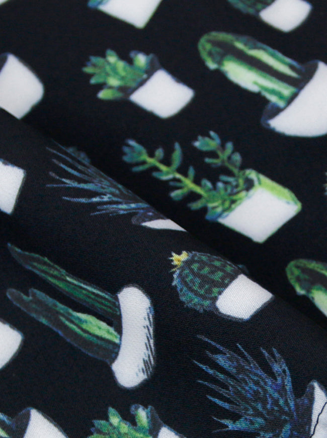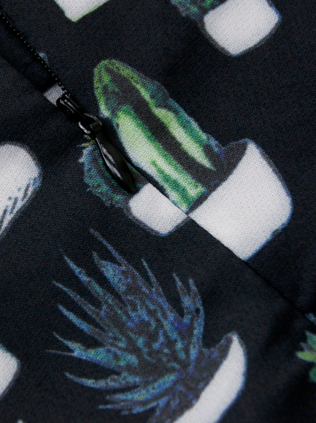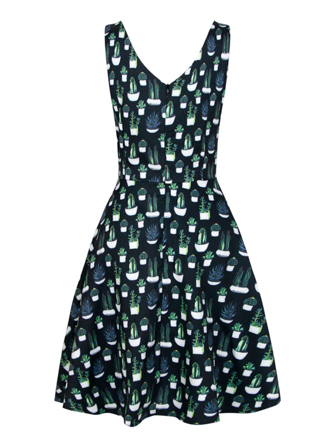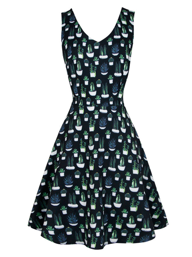 Sleeveless, V-neckline, Knee Length, A-line Style, Pleated Design, Back Zipper, Covered with Cute Cactus Pattern.
