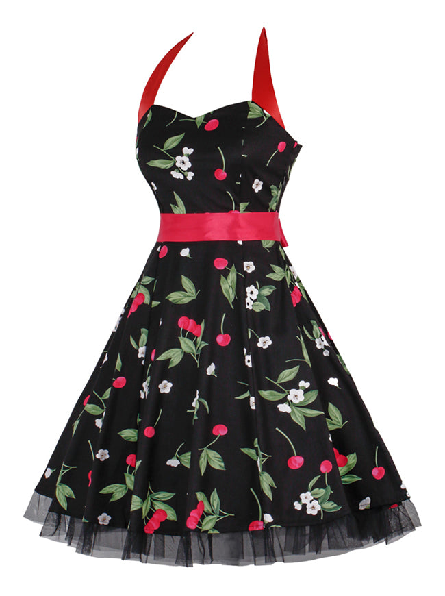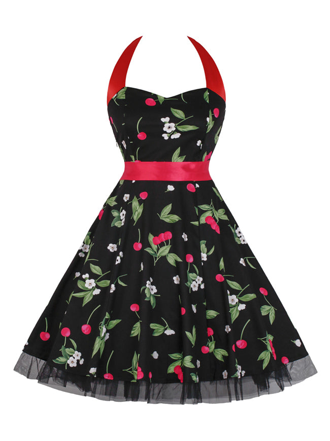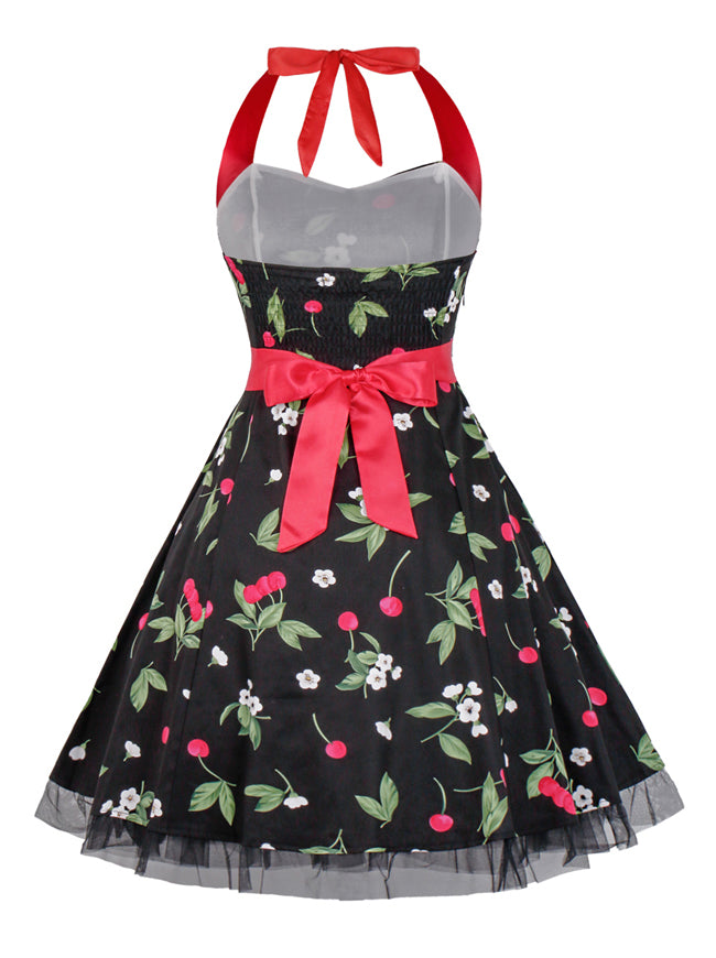 Sweetheart Halterneck Cherry Print Casual Summer Cocktail Dress