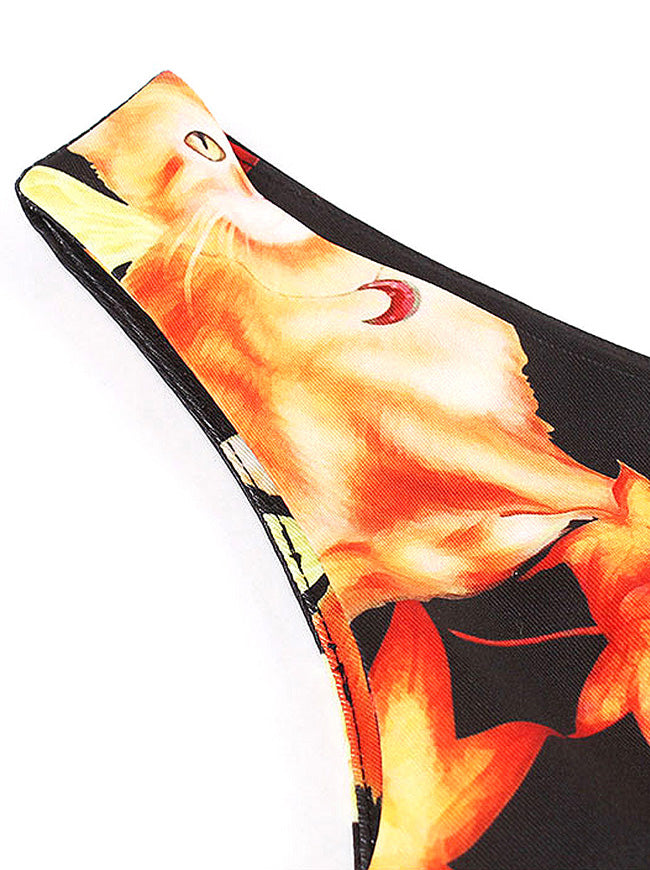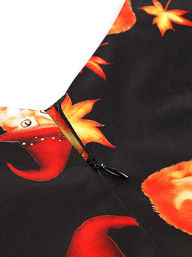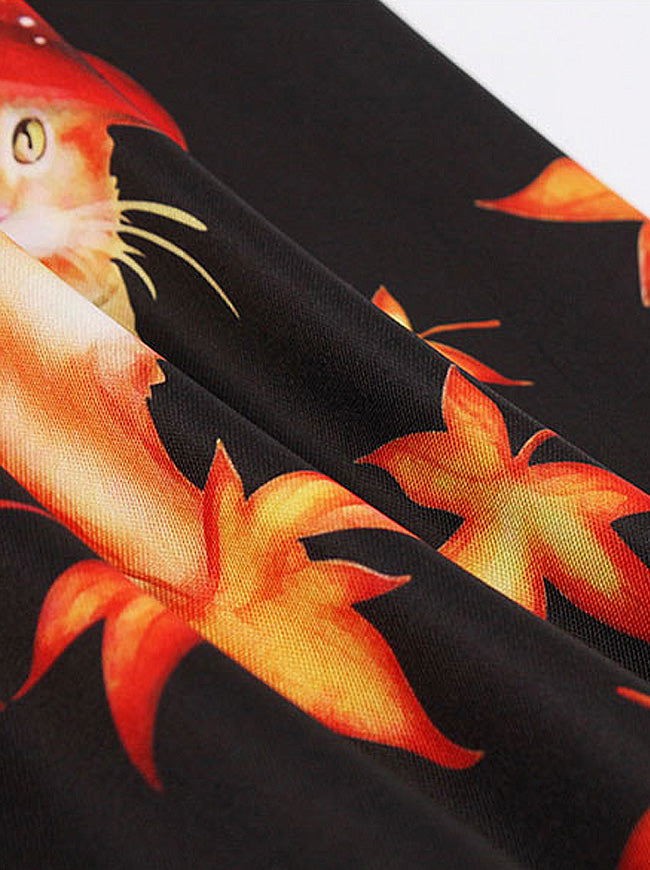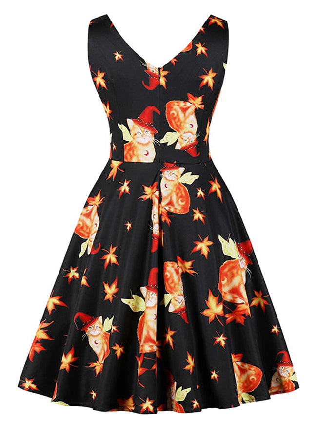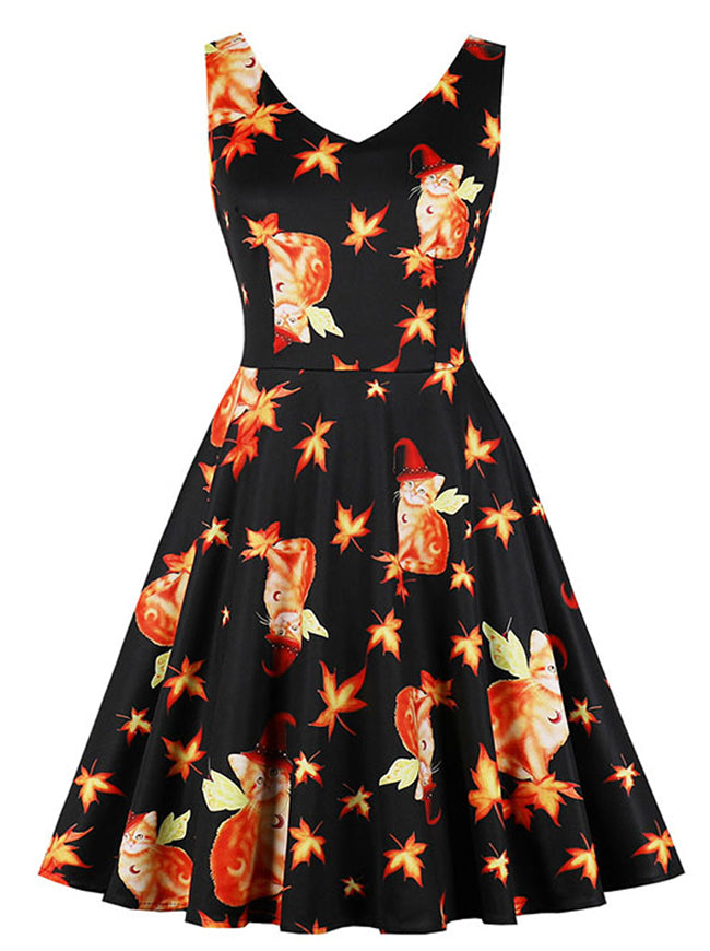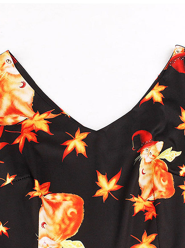 Vintage Cat Pattern Maple Leaf Print Cocktail Dress For Halloween Party