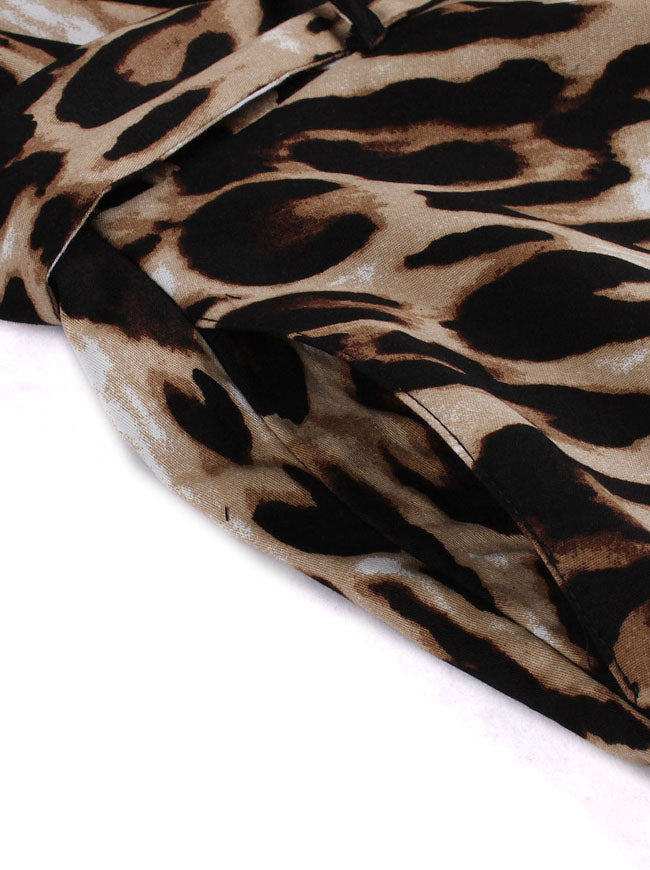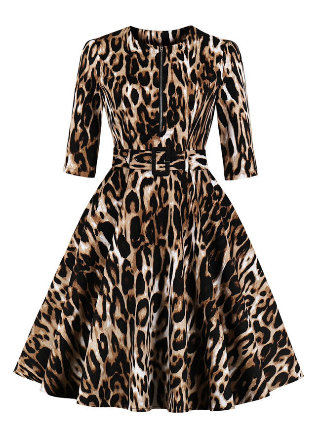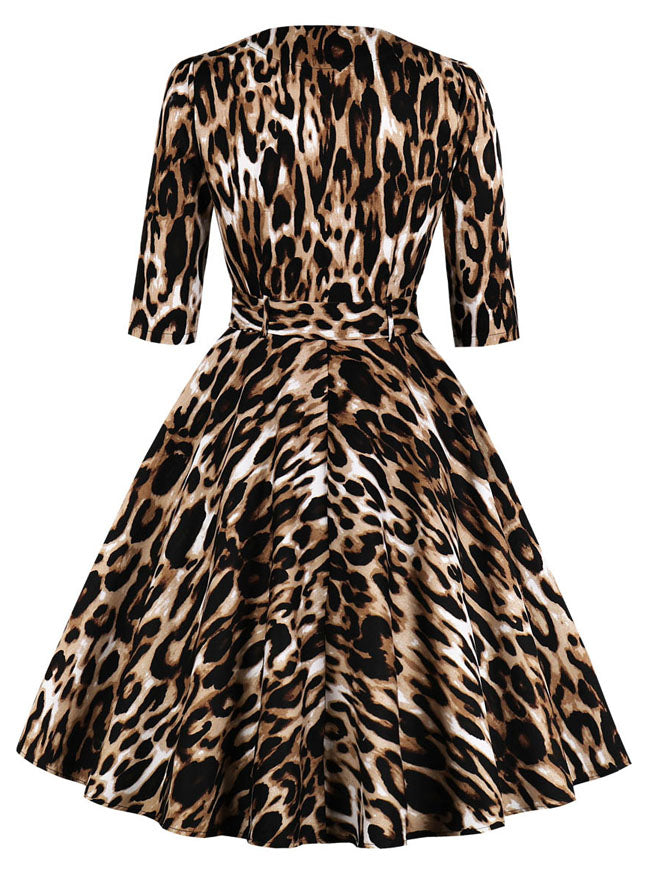Vintage Half Sleeve Leopard Print Flare Wear to Work Dress Belt