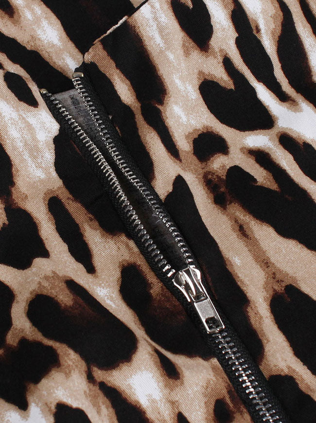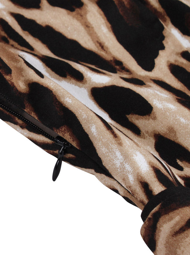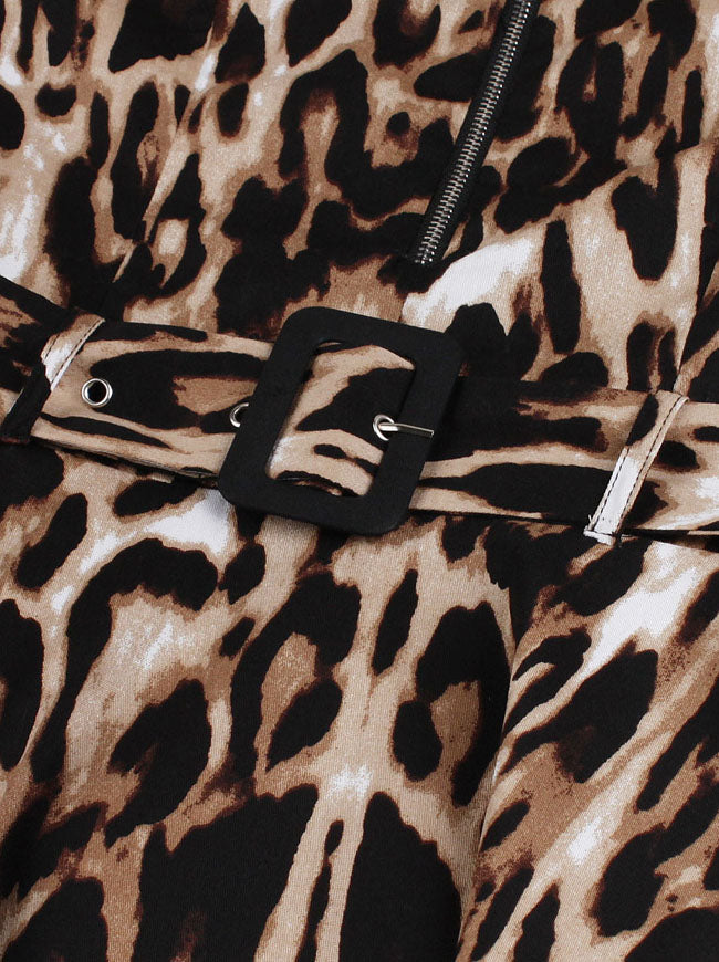 1950s retro printed dress: half sleeve, round neck, decorate with silver metal zipper closure in front, pocket in both side, sexy leopard pattern cover all over the dress, comes with adjustable belt, A-line knee length dress, conceal zipper in side.
