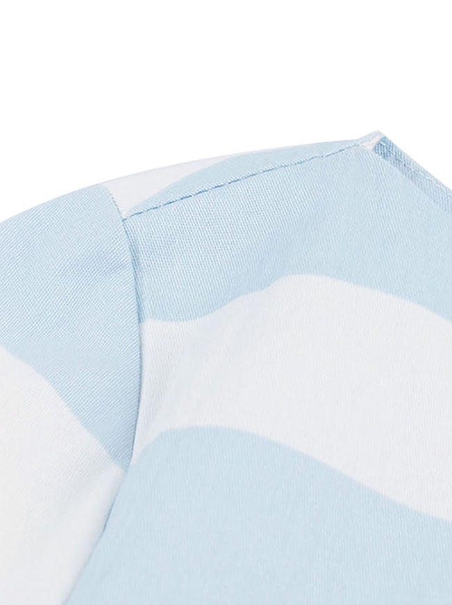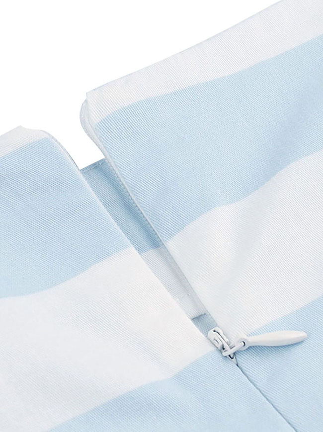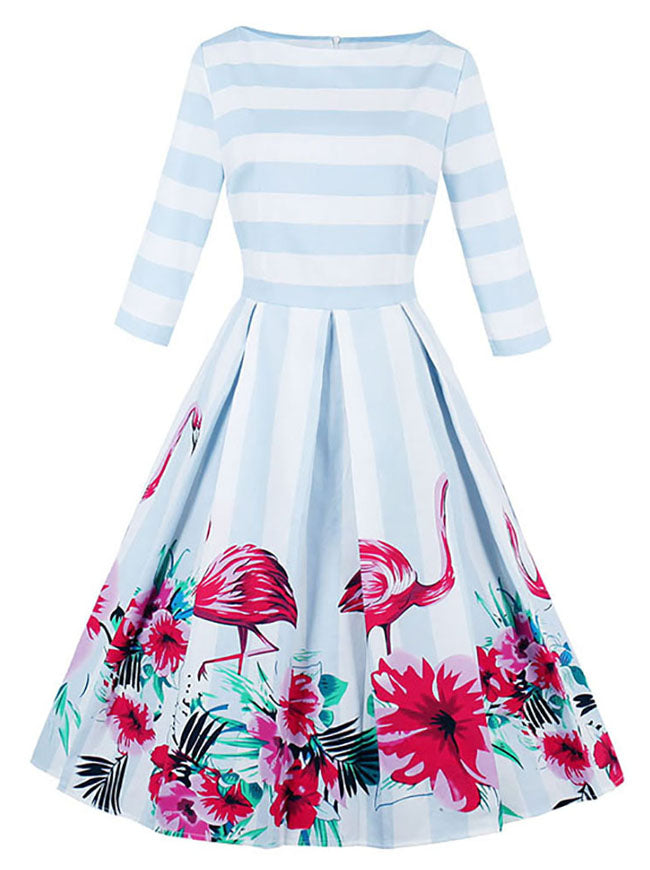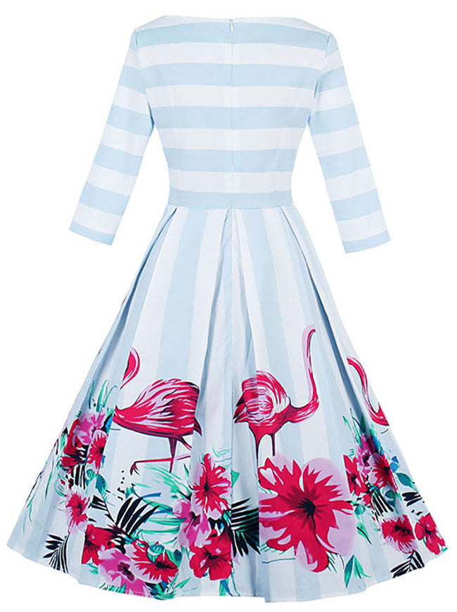 Vintage Blue and White Striped Dress Features Beautiful Flamingo and Flower Pattern, Boat Neck and A Line Style,Pleated Design on Skirt, 3/4 Length Sleeves, Back with Concealed Zipper.