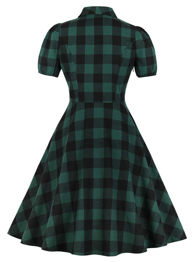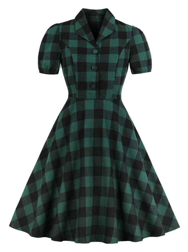 Vintage Retro Plaid Short Sleeve V-Neck Swing Dress with Pocket
