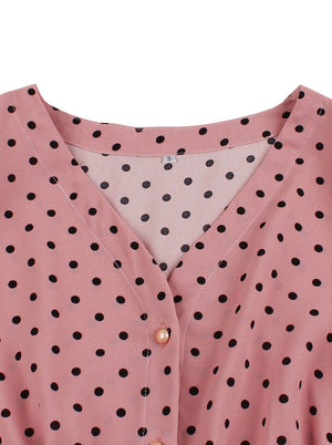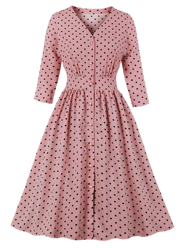 Women fashion elegant vintage 1950s style tea party dress features: 3/4 sleeve, v-neck, high waist, pink classic polka dots pattern cover the whole dress, row of buttons at front.
