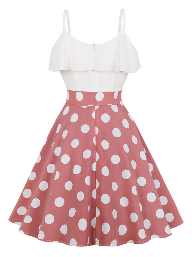 Summer fashion vintage style holiday midi dress features: sexy spaghetti straps design, white ruffle bodice top connect with classic polka dots print flared skirt, hidden zipper at the back, high waist, with pockets.